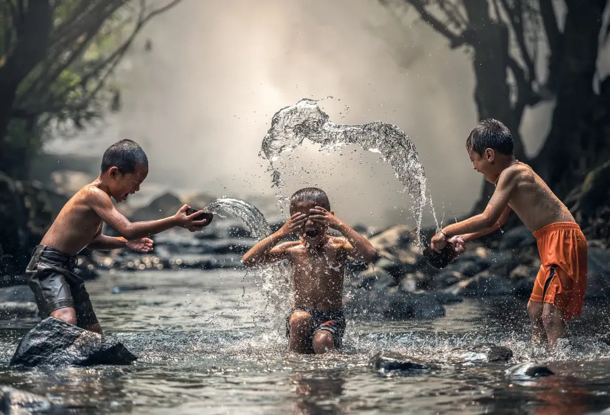 Laughter echoes off the river’s banks, As we dive into its welcoming ranks.